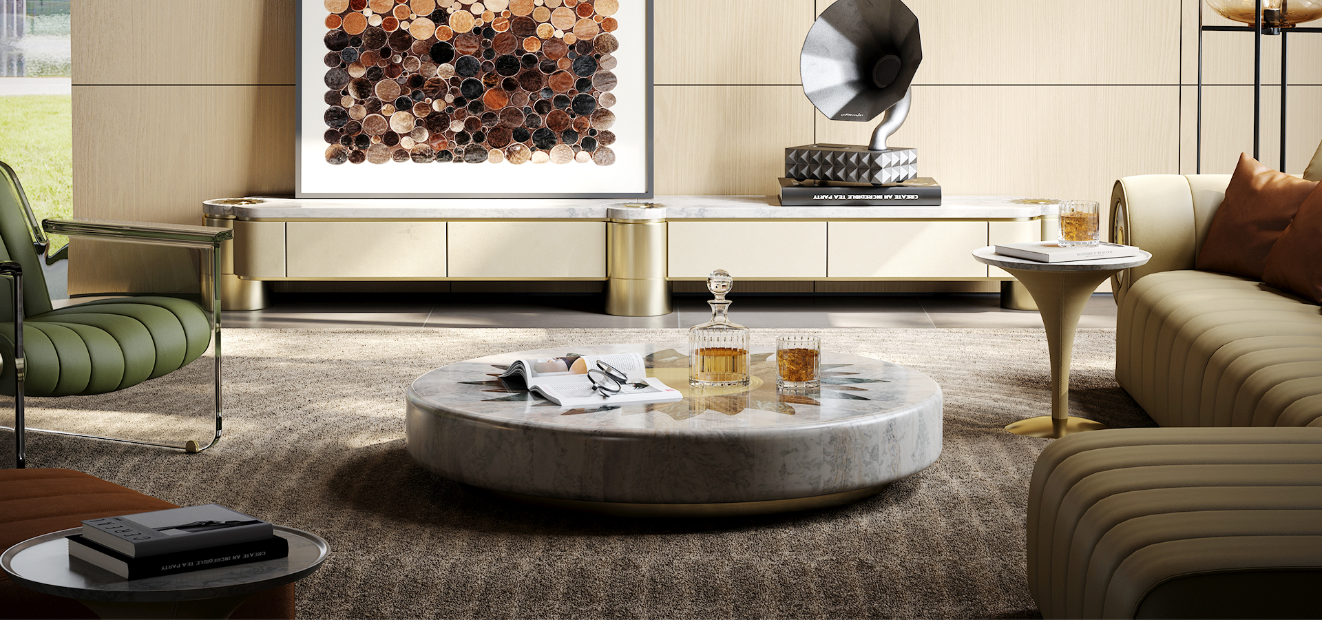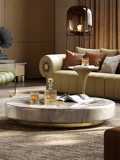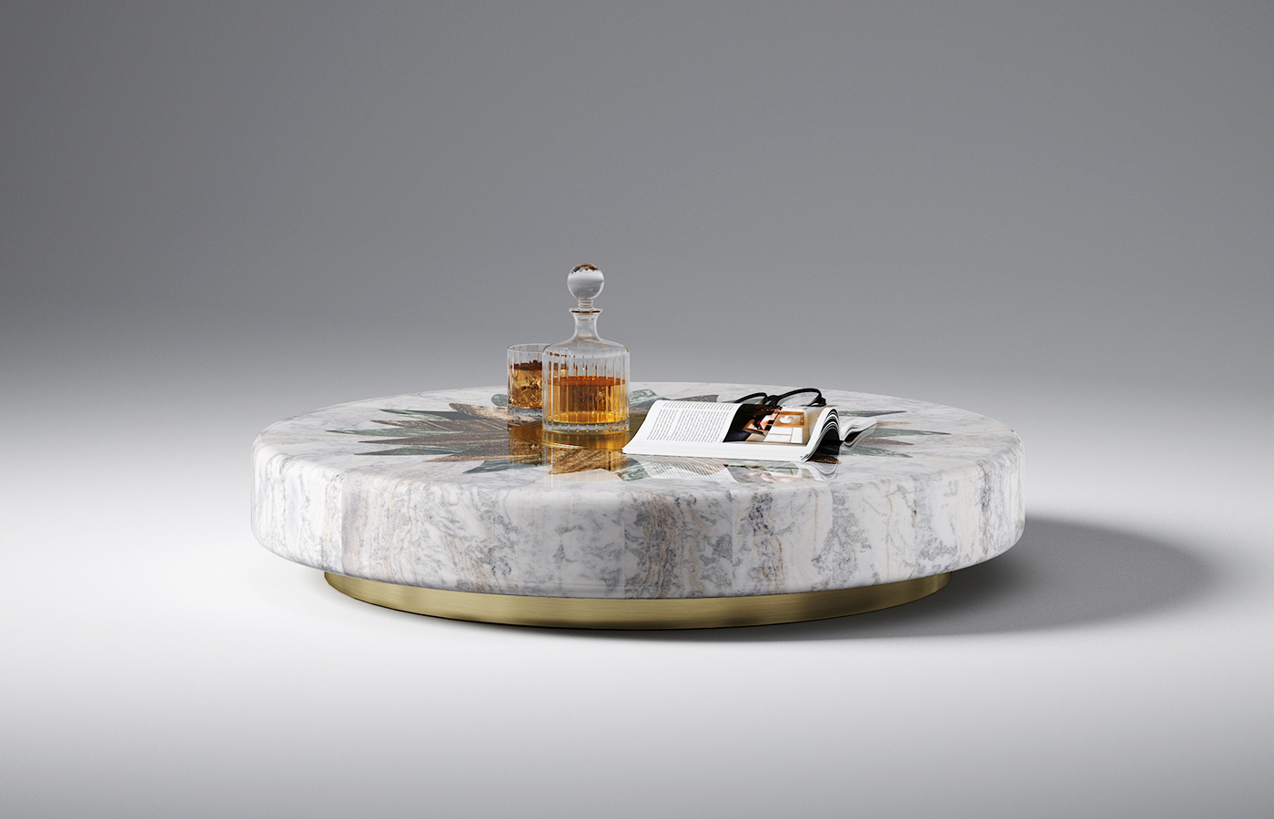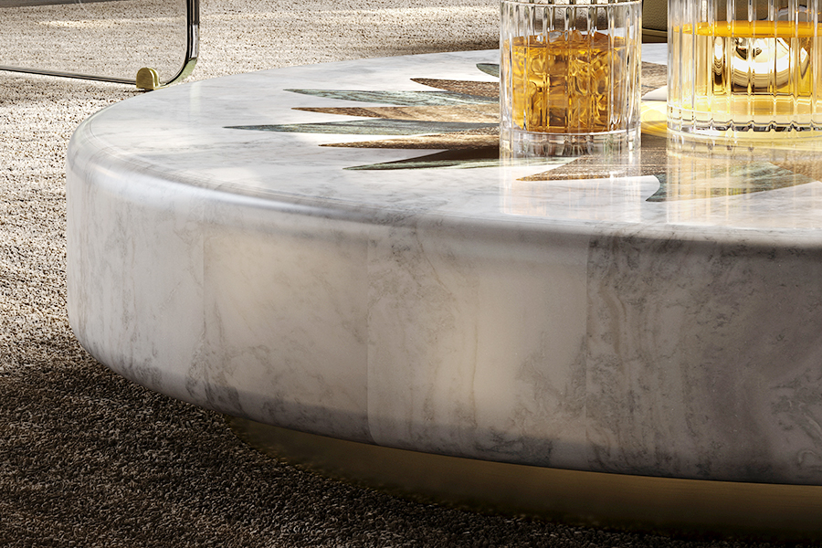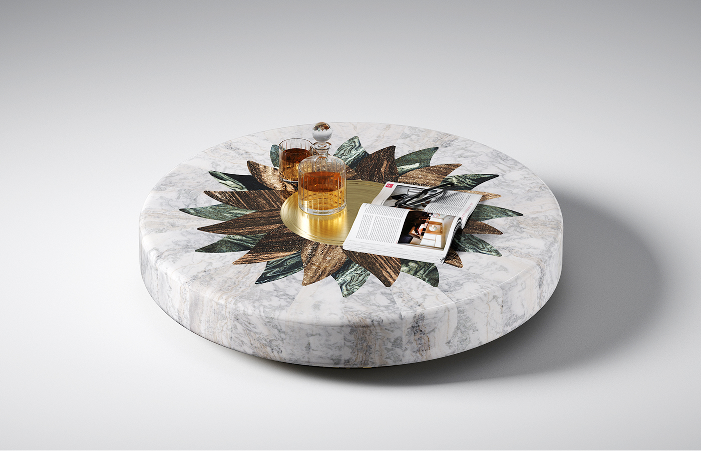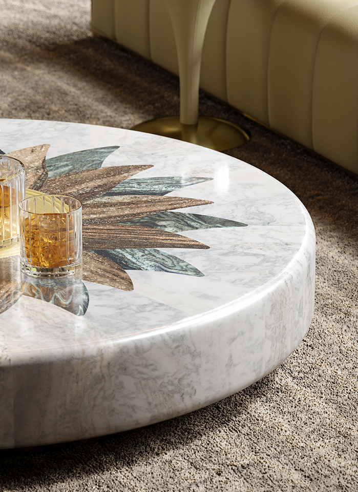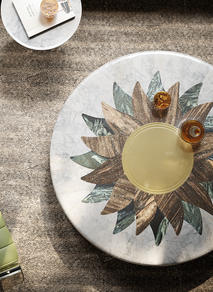 台面多种奢石拼花设计,葵花造型熠熠生辉,宛如一轮金黄色的太阳,镶嵌在辽阔的海洋中。 |